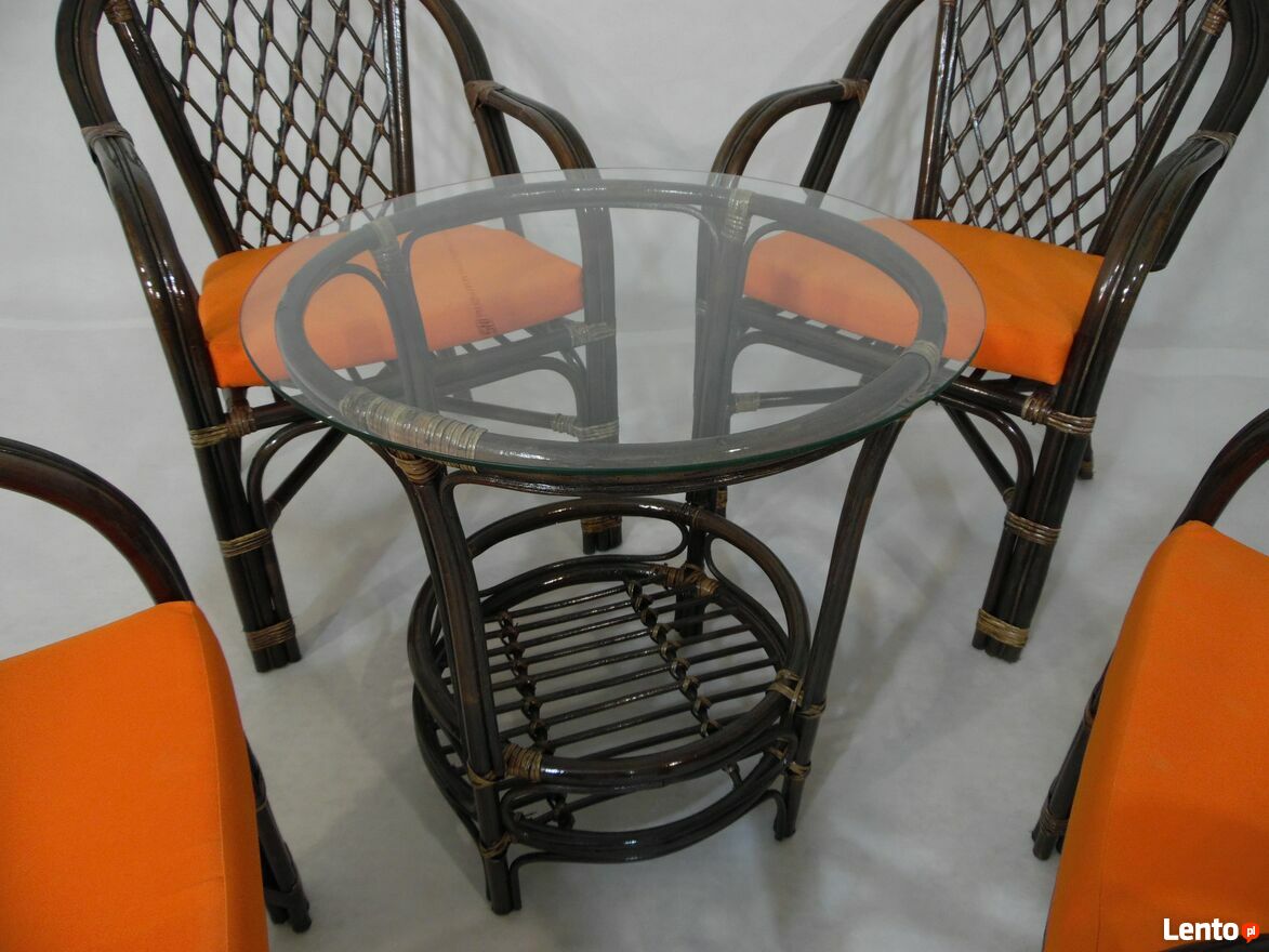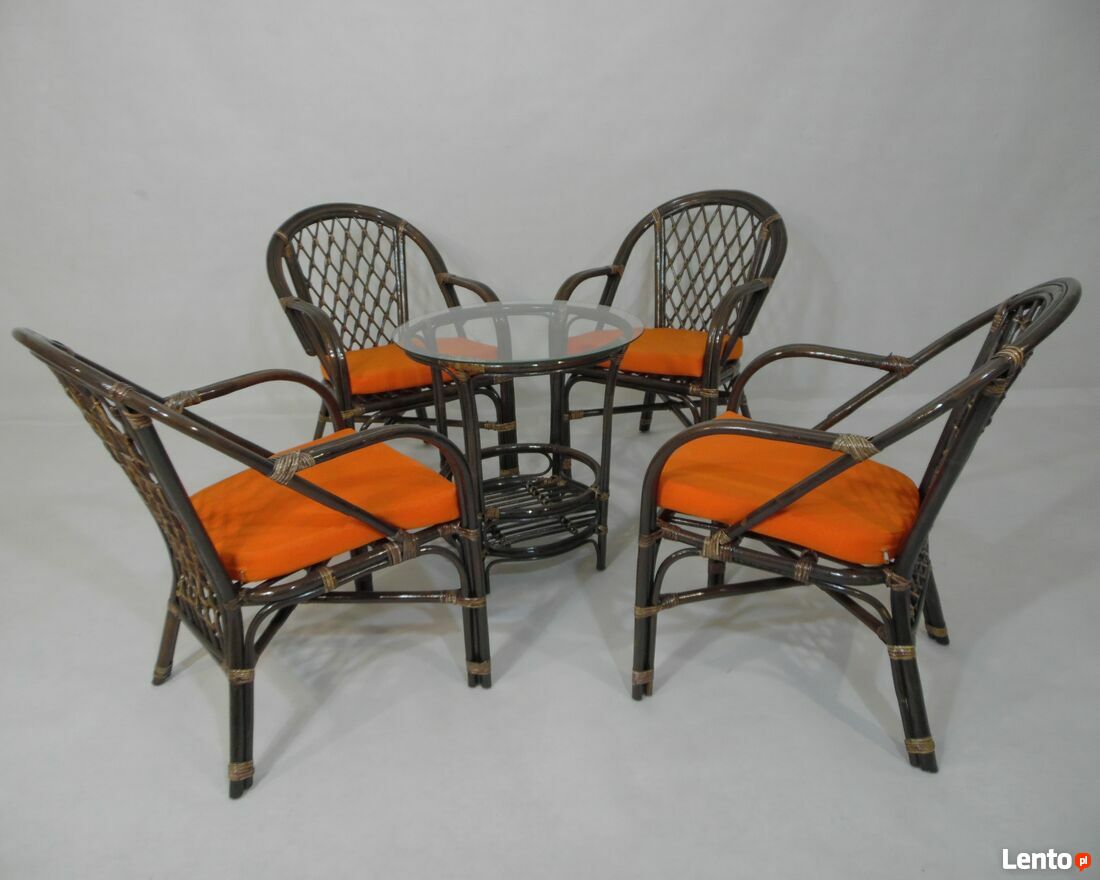 Zestaw mebli rattanowych składa się z 4 foteli i stolika ze szklanym blatem.Rattanowy komplet do ogrodu wykonany jest z mocnego, trwałego naturalnego rattanu. Rattan, którego użyto do stworzenia zestawu został wypolerowany, a następnie polakierowany, aby maksymalnie zabezpieczyć drewno przed chłonięciem wilgoci i uodpornić go na niekorzystne warunki atmosferyczne. Meble wykonane z naturalnego rattanu mogą posiadać przebarwienia, sęki które są naturalnymi cechami rattanu.