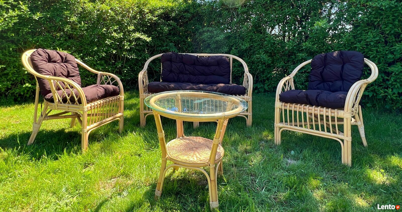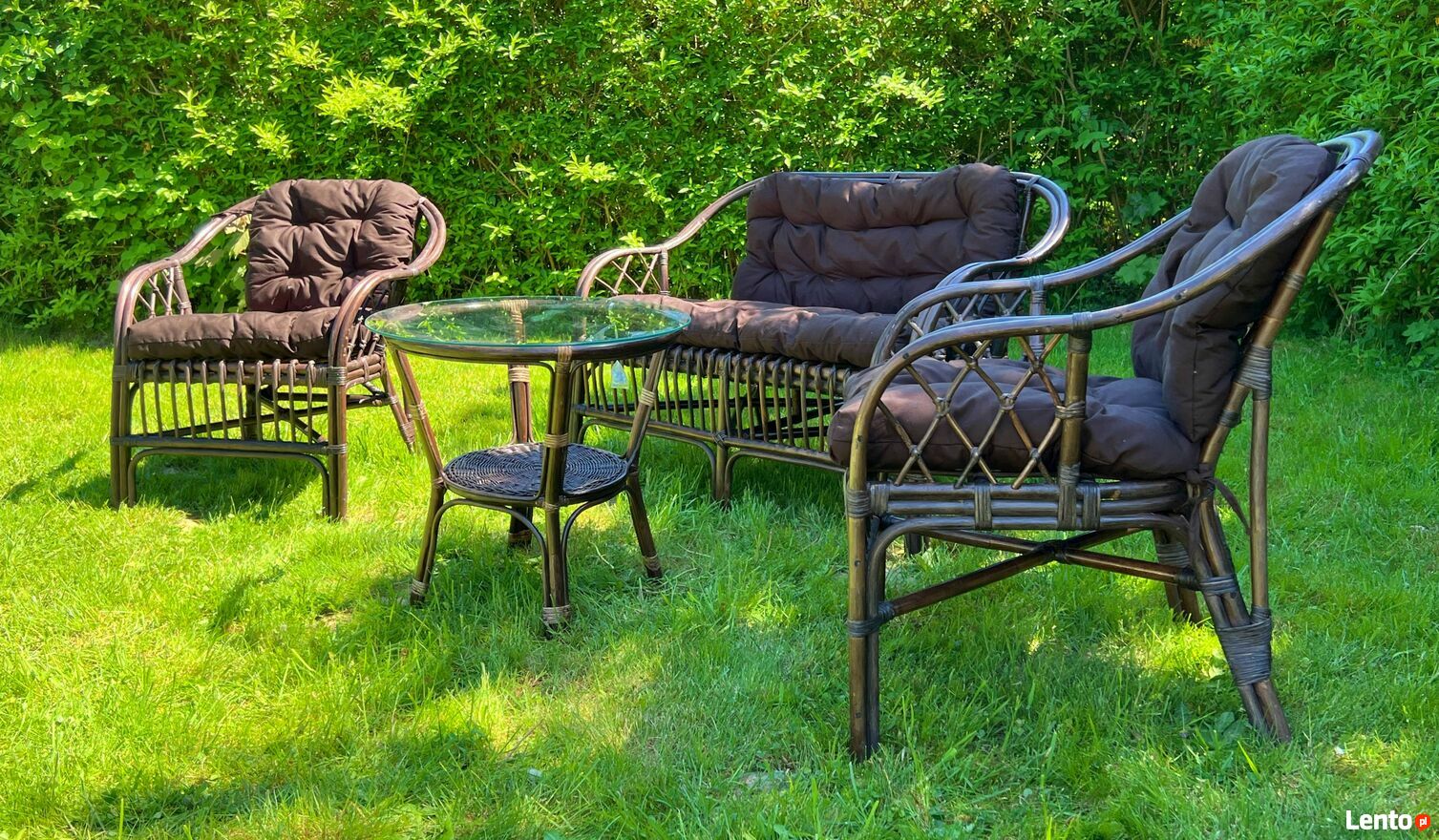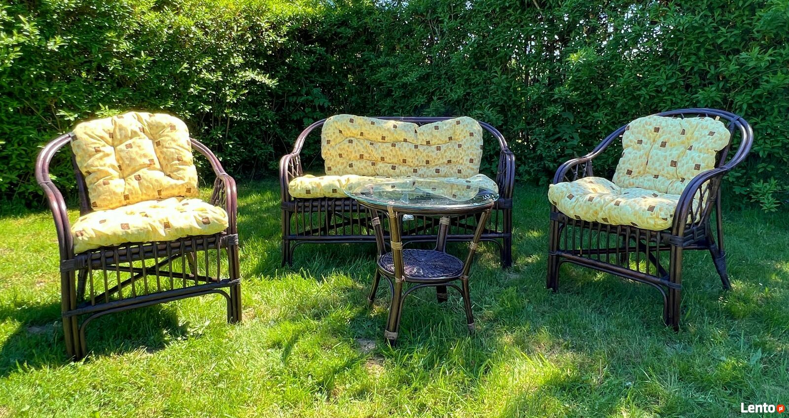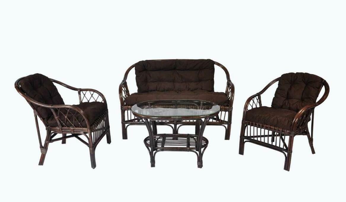 Zestaw mebli ogrodowych dla 3-4 osób. Elementy zestawu: stolik, 2 fotele, sofa, poduchy do foteli i sofy, szklany blat do stolikaDane techniczne: